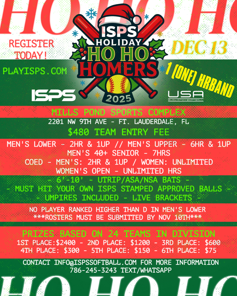 The holiday season is here, and what better way to celebrate than with some friendly competition and home runs? The ISPS Holiday Ho Ho Homers Tournament is set for December 13 at Mills Pond Sports Complex in Fort Lauderdale, Florida, promising a day filled with thrilling softball, holiday cheer, and giving back to the community!