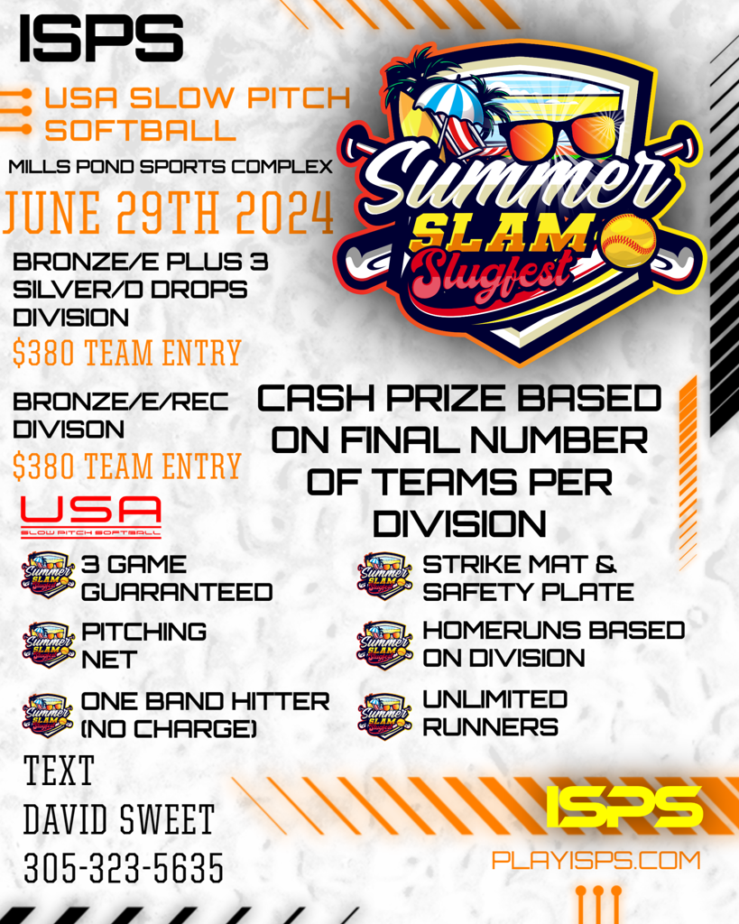 Join us on June 29, 2024, at Mills Pond Sports Complex for the ISPS Summer Slam Slugfest. Exciting games, cash prizes, and endless fun await!