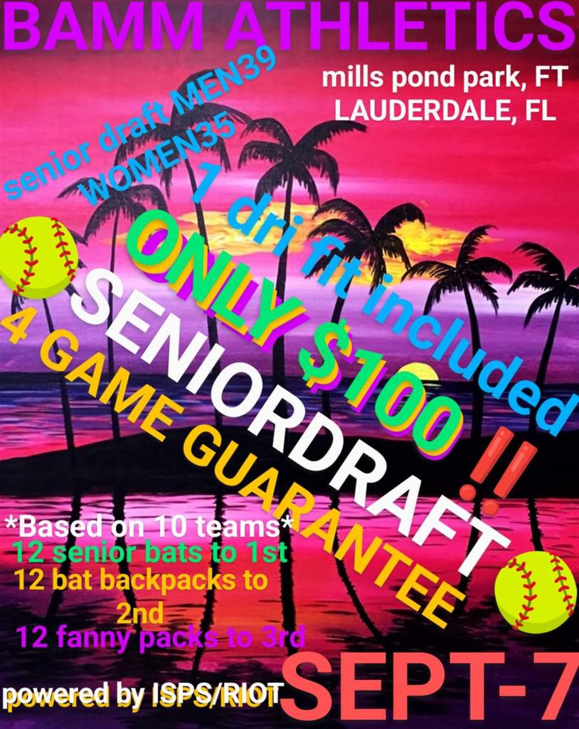 Step up to the plate this September! Join the BAMM Athletics Senior Draft in Ft. Lauderdale for an epic day of slow-pitch competition, incredible prizes, and lifelong memories. Sign up now for just $100 and guarantee your spot!