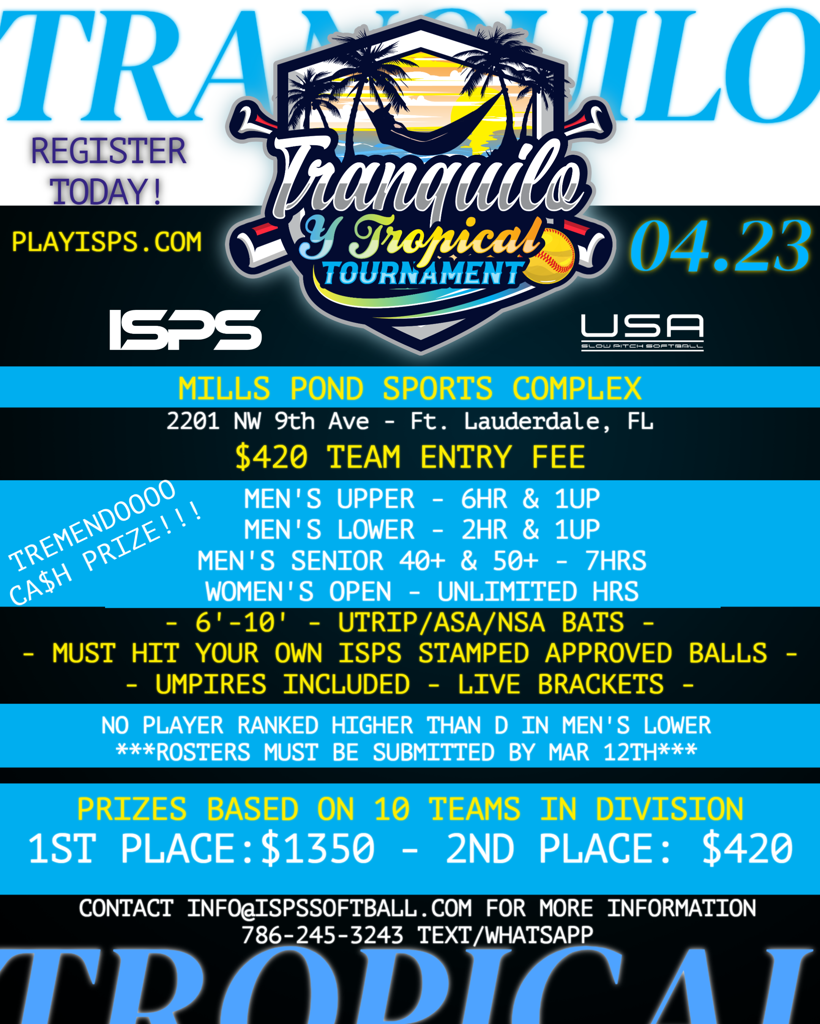 The International Slow Pitch Softball (ISPS) organization is thrilled to unveil the "Tranquilo y Tropical Tournament," a one-of-a-kind event that brings slow-pitch softball lovers together for an incredible day of competition and camaraderie. Scheduled for April 26, 2025, at the beautiful Mills Pond Sports Complex in Fort Lauderdale, FL, this tournament promises to offer players a truly tropical, laid-back vibe with the thrill of competitive softball.