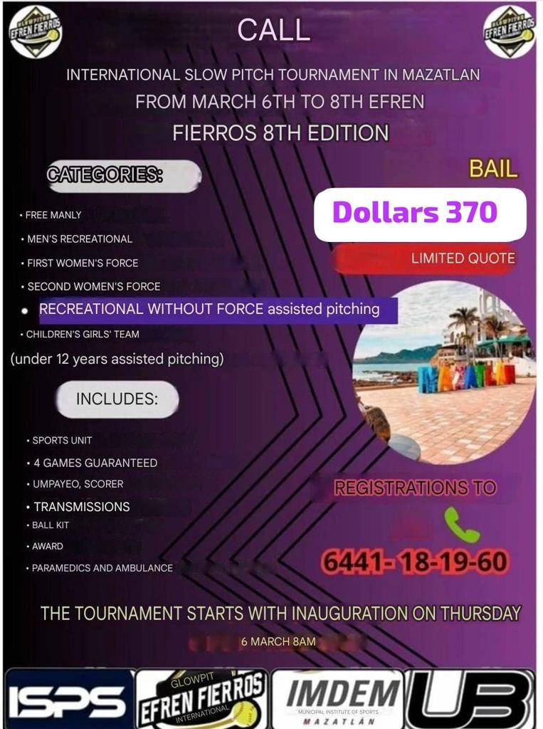 Heading to Mazatlán! Efren Fierros 8th Edition Slow Pitch Tournament from March 6–8, 2025. Categories for everyone—Men’s, Women’s, and Kids! Register now via WhatsApp: 6441-18-19-60