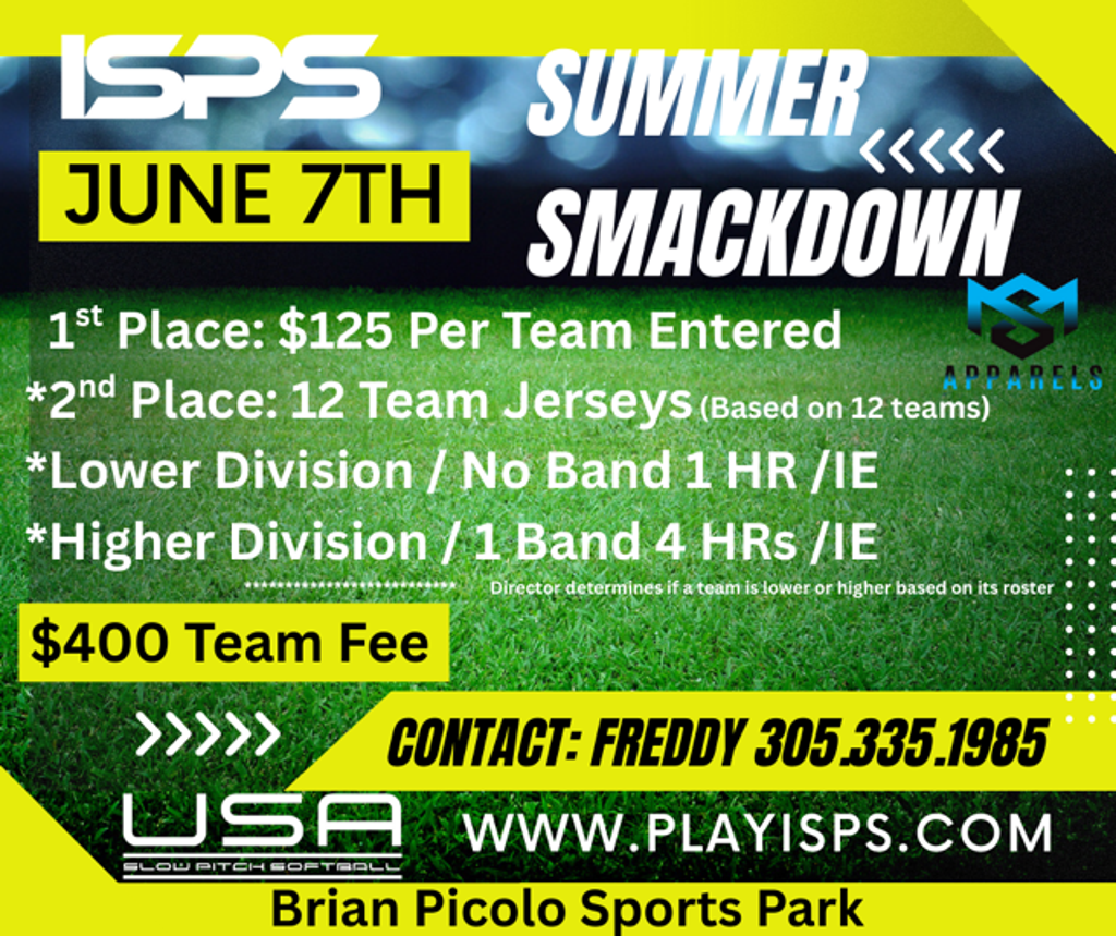 The stage is set and the stakes are sizzling. On June 7th, ISPS (International Slow Pitch Softball) presents the Summer Smackdown at Brian Piccolo Sports Park, and it promises to be one of the most explosive slow-pitch events of the season.